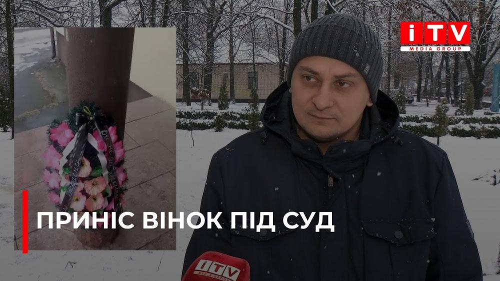 Це відео записав громадський активіст Олександр Лада. Саме він приніс під стіни районного суду Костополя похоронний вінок.