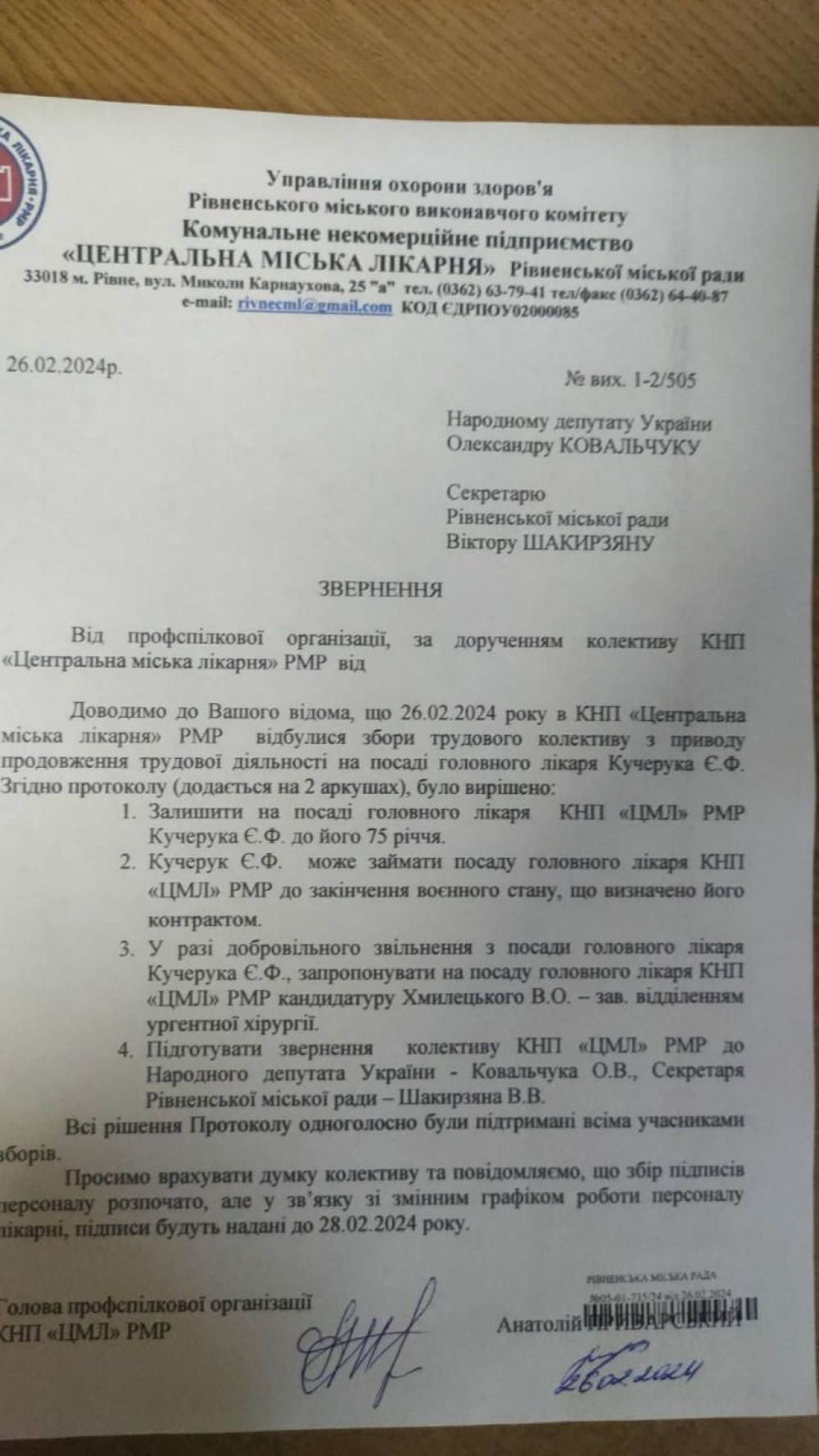 Сьогодні, 27 лютого, відповідне звернення від профспілки та колективу лікарні направили в. о. міського голови Рівного Віктору Шакирзяну та народному депутату від міста Олександру Ковальчуку.