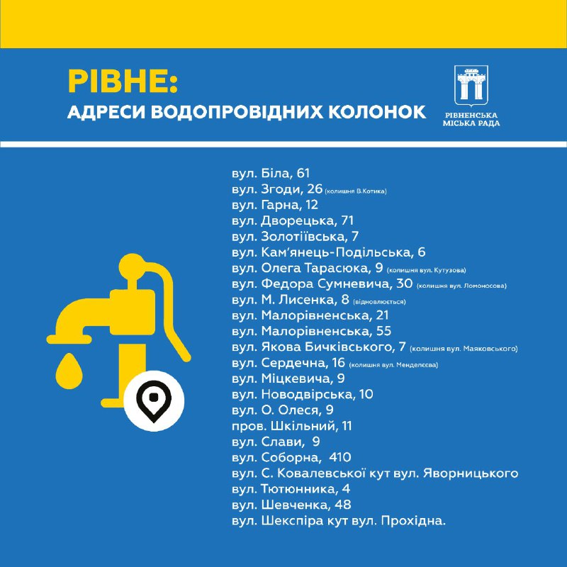 У Рівному через планові відключення світла, також можливі проблеми з водопостачання. У випадку надзвичайної ситуації, якщо у місті буде відсутнє водопостачання, можна скористатися водопровідними колонками.