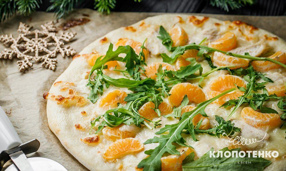 За винятком мандаринів, начинка в цій піці досить класична: запечена курка, вершки, моцарела і рукола. Курку можна також відварити чи обсмажити. Мандарини ж дають приємний баланс солодкого і солоного, а їх текстура цікаво грає з іншими. А взагалі таке дріжджове тісто для піци чудово смакує з будь-якими начинками. Навіть солодка піца готується на цій основі, тож не обмежуйте себе в своїх бажаннях і експериментах.