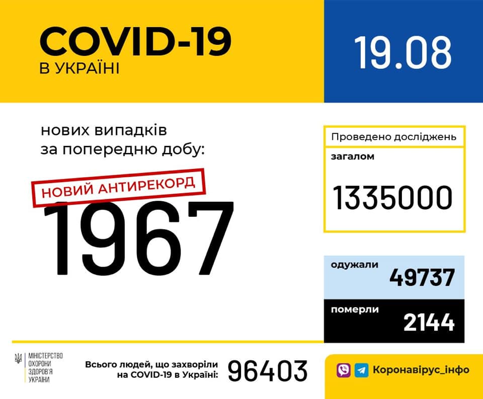 19 серпня (станом на 9:00) в Україні 96 403 лабораторно підтверджені випадки COVID-19, з них 2144 летальні, 49 737 пацієнтів одужало. За добу зафіксовано 1967 нових випадків.