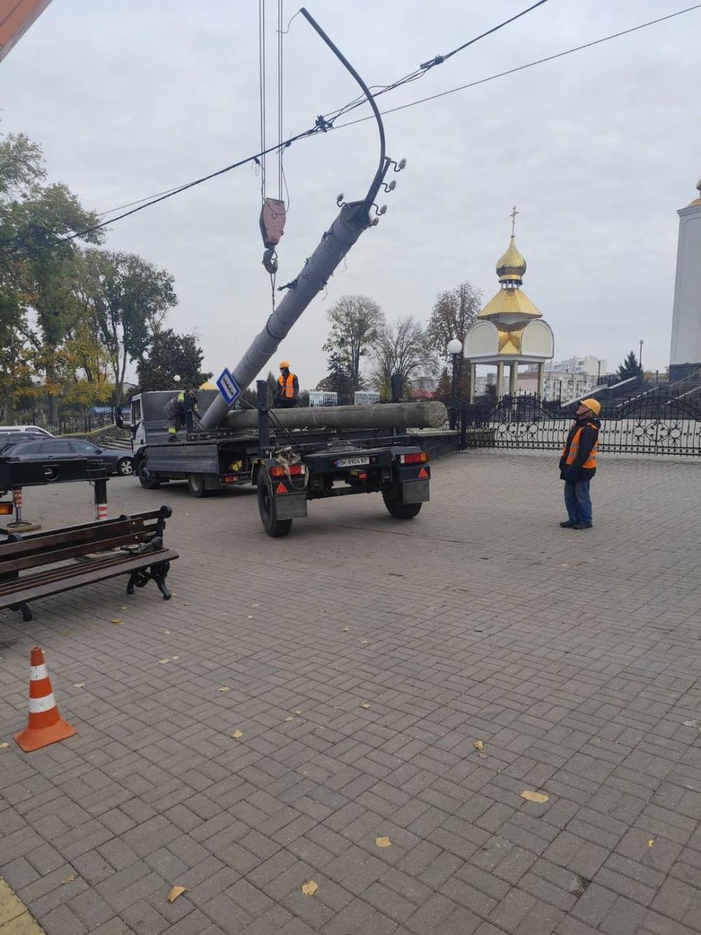 Працівники служби електрогосподарства КП «Рівнеелектроавтотранс» провели роботи з демонтажу аварійних опор контактної мережі на перехресті вулиць Соборна - Князя Володимира, а також на вулиці Соборній поблизу Луцька кільця.