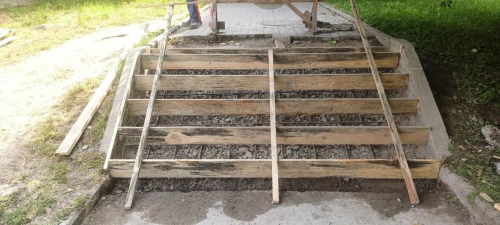 Спочатку комунальники підготували основу та встановили дерев'яну опалубку, яка сформувала майбутні сходинки. Після цього провели бетонування конструкції. Свіжий бетон залили в опалубку, надаючи сходам необхідну форму та міцність.