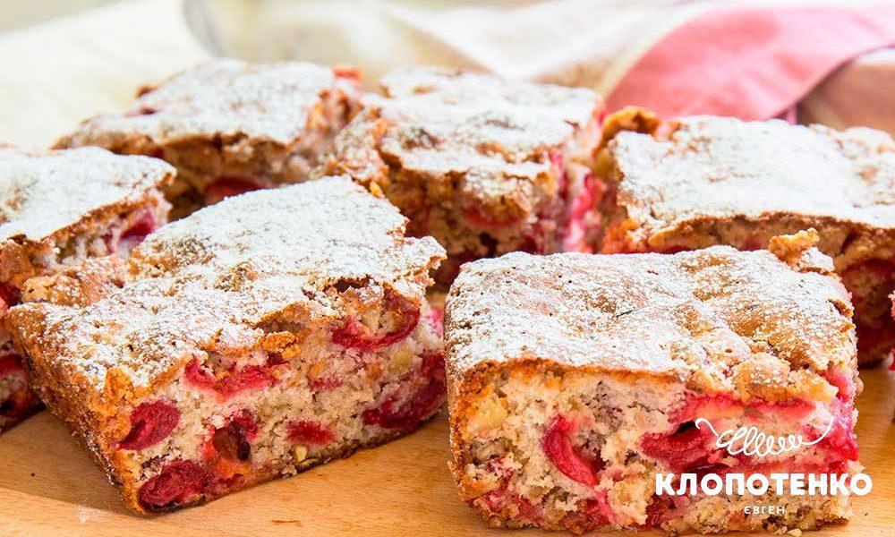 Секрет успіху цього реццепту простий — соковита вишня і пружний горіх. Разом з карамельною скоринкою вони творять дива зі смаковими рецепторами. На додачу до цього пиріг напрочуд швидко та просто готується — змішали разом всі інгредієнти, переклали у форму для запікання і до духовки.