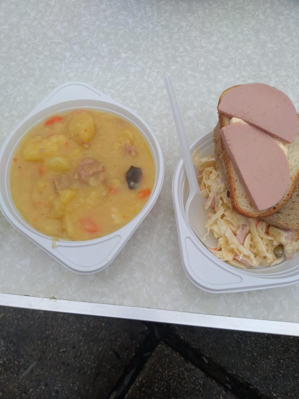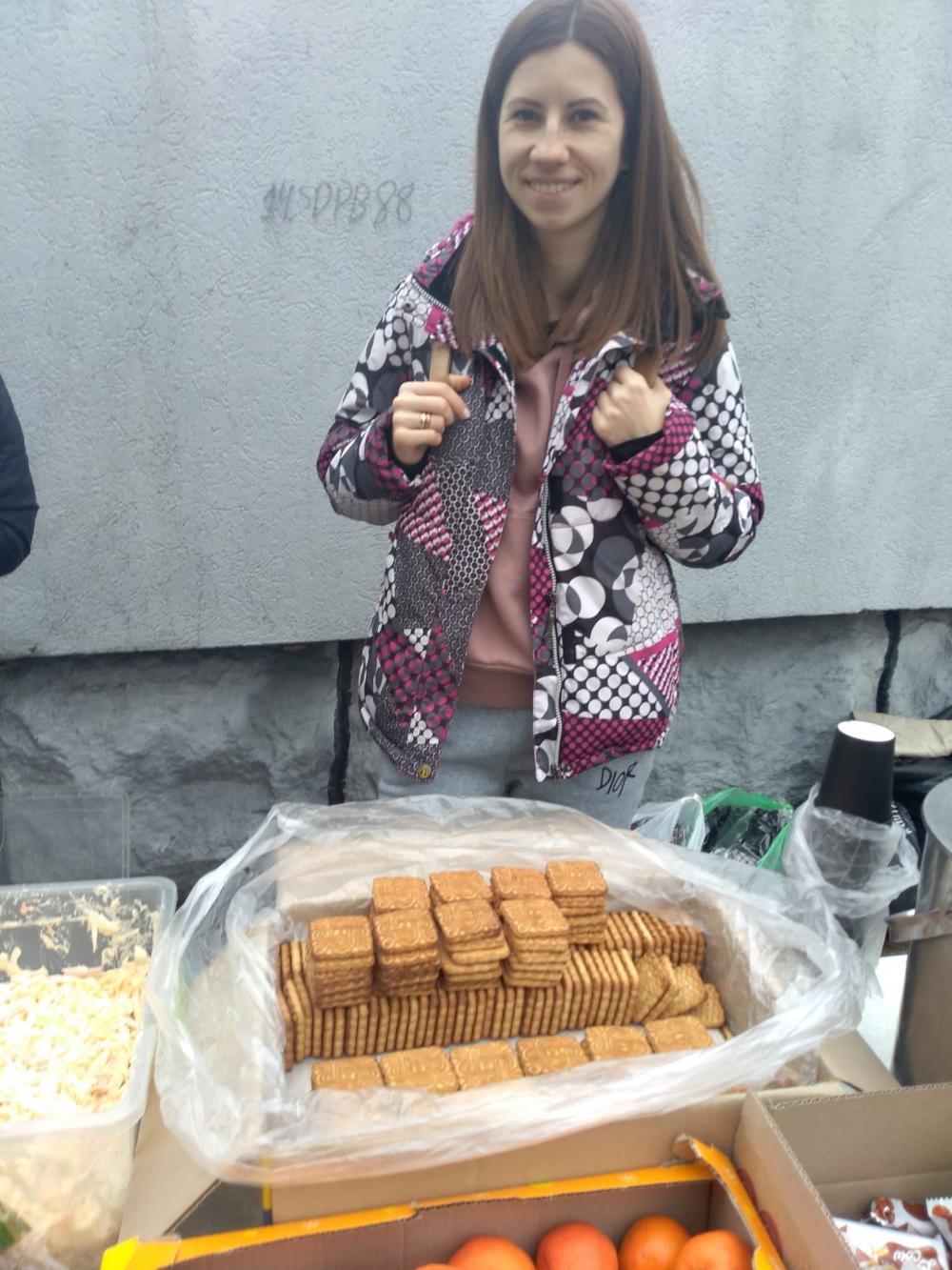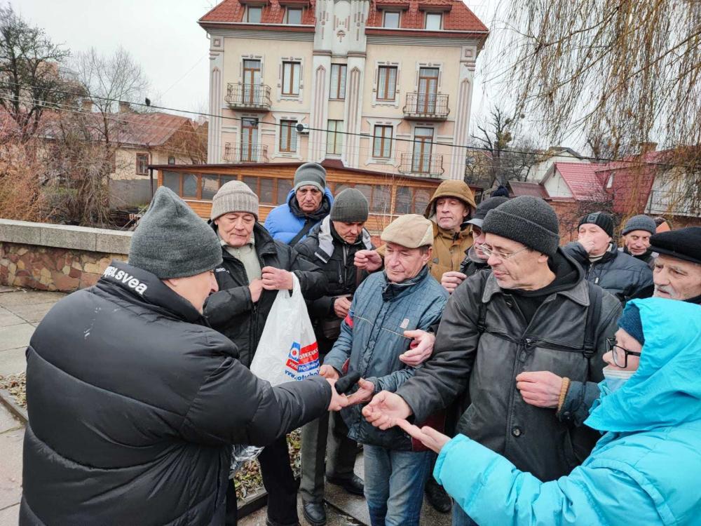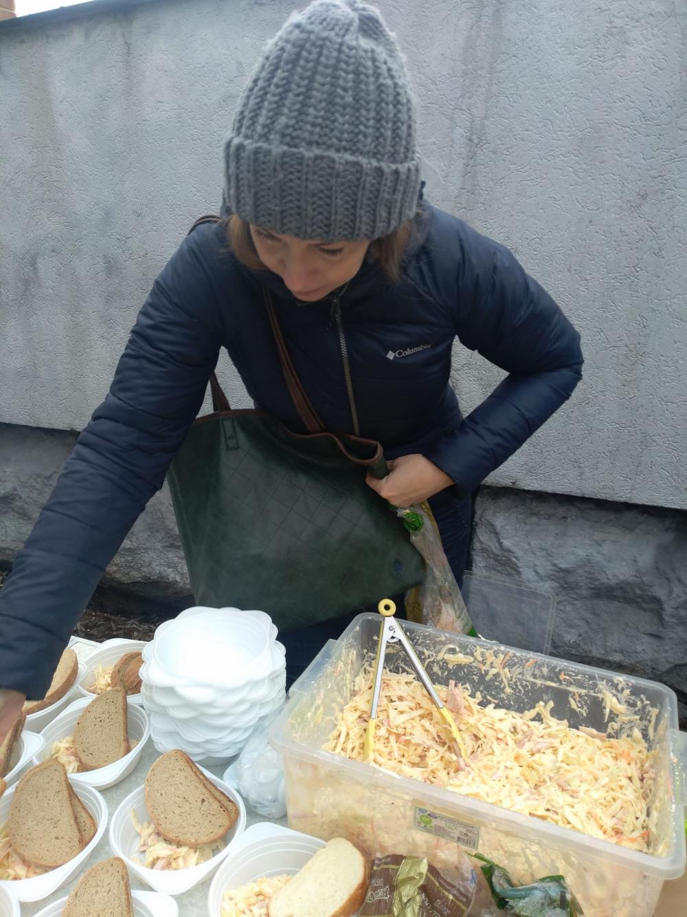 Пригощали потребуючих тушеною картоплею з м'ясом, салатом з капустою, бутербродами, мандаринами та солодощами. Також роздавали теплі шкарпетки, одяг та взуття.
