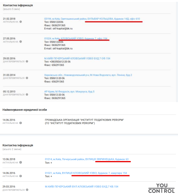 Підтвердженням близькості громадської організації «Інститут податкових реформ» до кримської піраміди «Сімейний капітал» є спільне місце реєстрації. За цією ж адресою зареєстровані й ГО «Молодь за віру, за європейську Україну» та ТОВ «КАД-Медіа», що є видавцем журналу «АгроПРО».