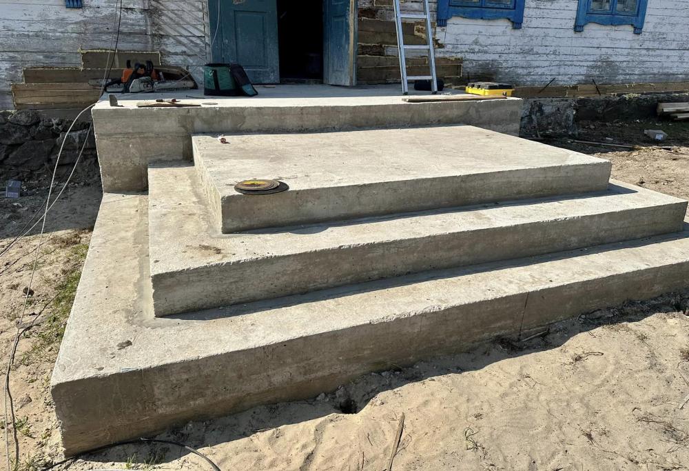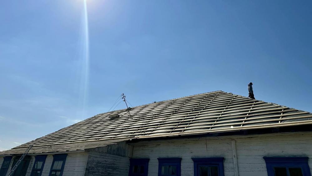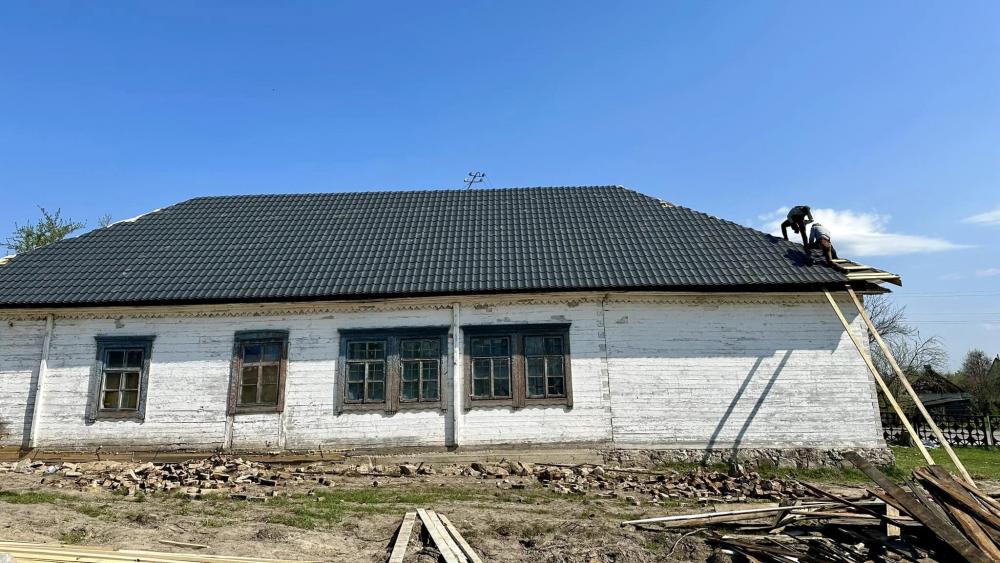 Майстри підняли та укріпили фундамент будівлі, зробили новий поріг і вже ремонтують дах, укладаючи нові покрівельні матеріали. Наступний етап робіт - встановлення вікон, дверей та облаштування фасаду.