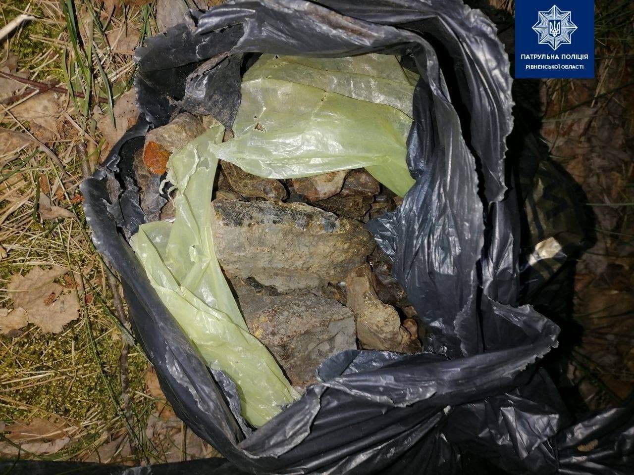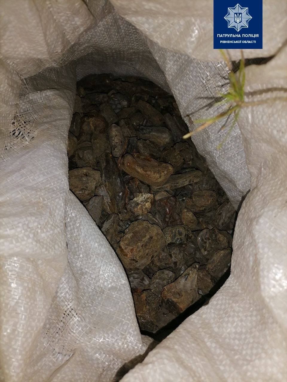 Коли патрульні підійшли до автомобіля, щоб поспілкуватись з керманичем, то побачили, як з пасажирського вікна викинули 2 чорних пакета. В них знаходилось каміння, ззовні схоже на сирець бурштину.
