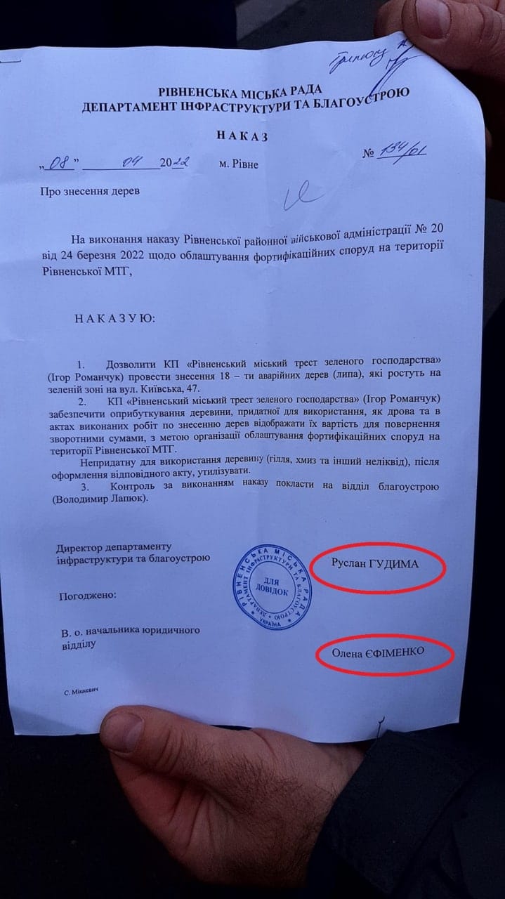 Раніше був опублікований наказ, у якому вказано, що 18 дерев були аварійними. Деревину ніби то планували використати на будівництво фортифікаційних споруд.