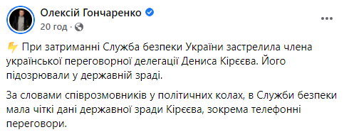 Перемовника від України на першій гомельській зустрічі Дениса Кірєєва вбили під час затримання Службою безпеки України. Попередньо Кірєєва запідозрили в держзраді.