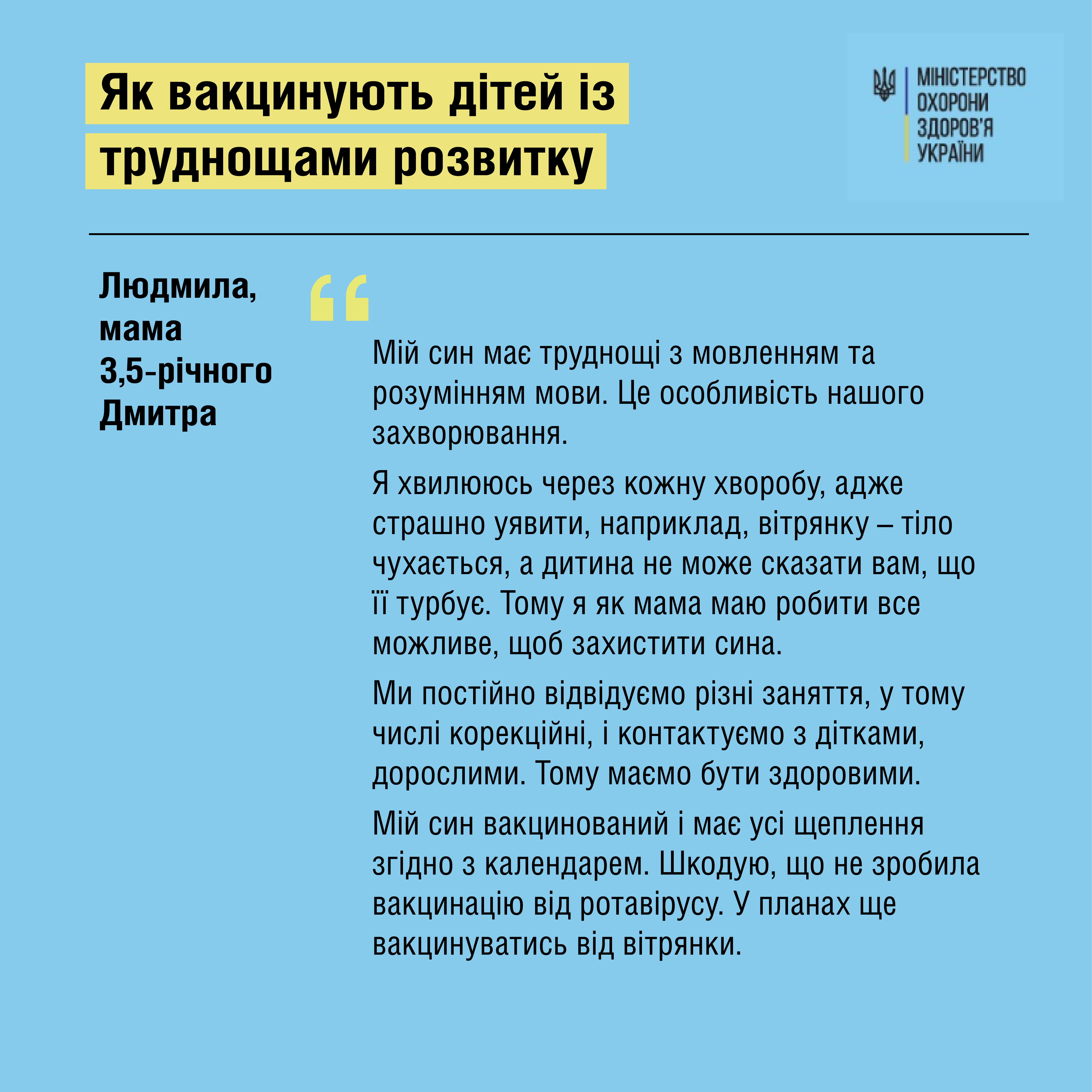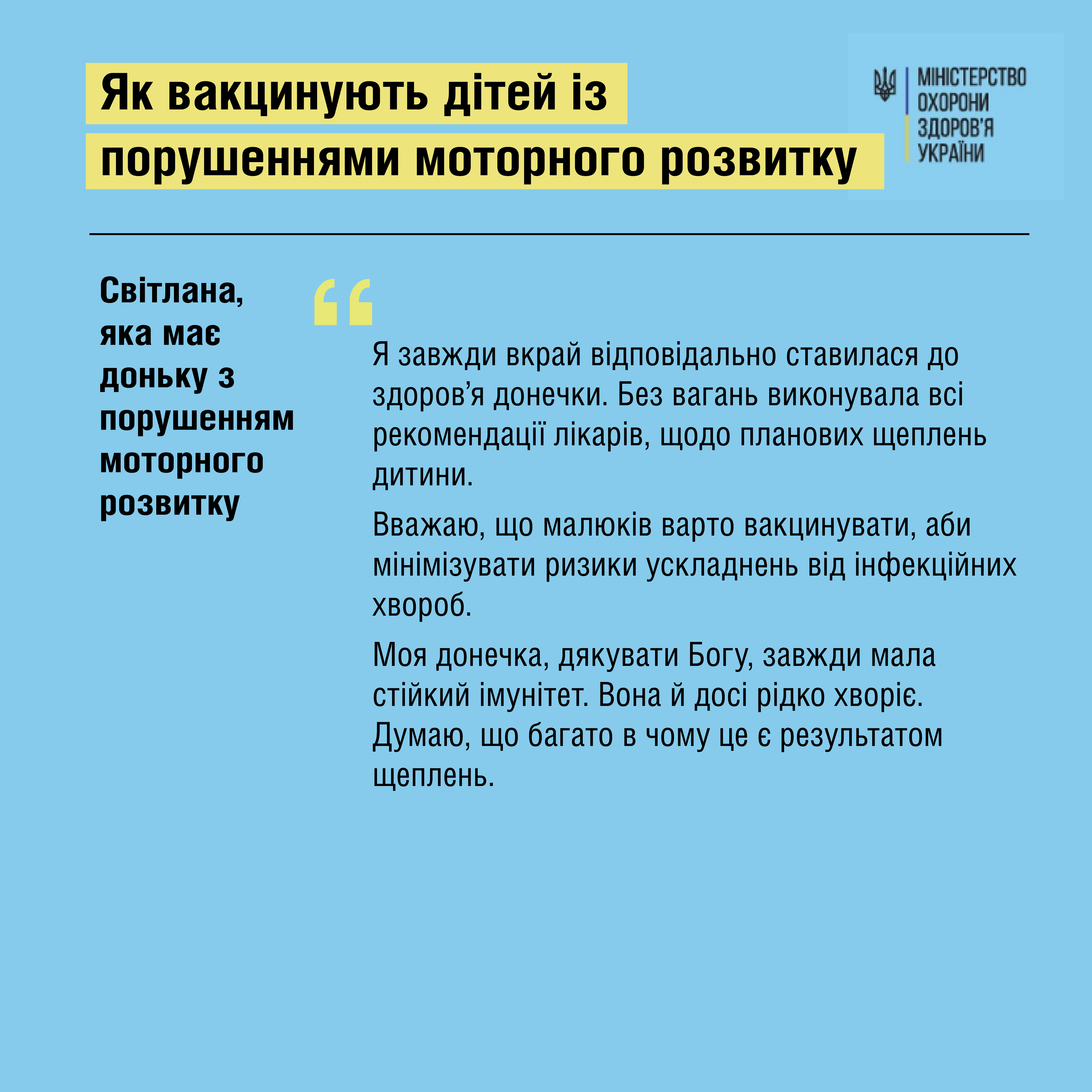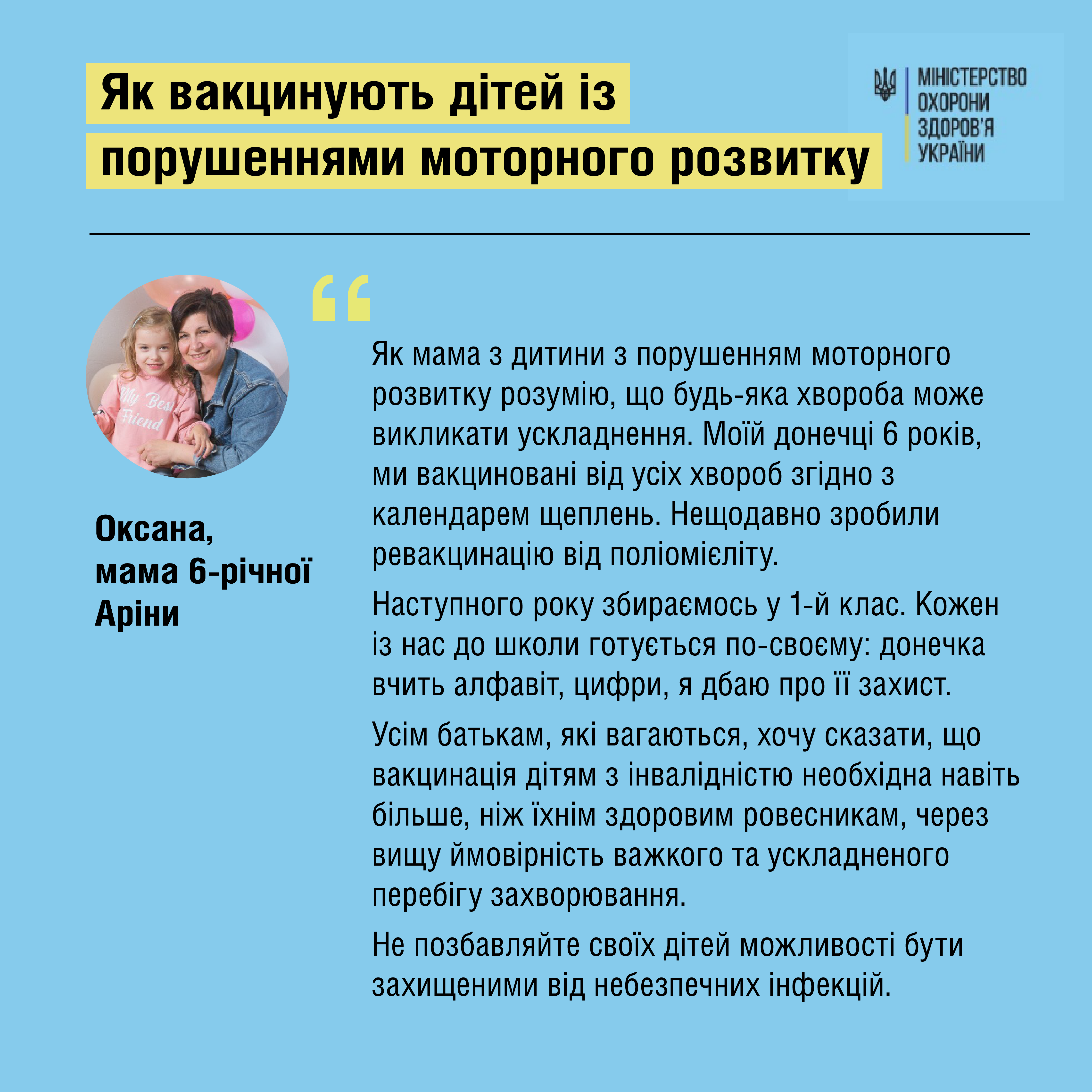 Часто батьки дітей із затримками моторного розвитку помилково думають, що для них щеплення протипоказані. Тоді ж як все навпаки – організм дітей з ДЦП, аутизмом, синдромом Дауна чи іншими порушеннями уразливіший до інфекцій, а хвороби можуть перебігати важко та нерідко завершуються ускладненнями. Також ці дітки проводять більше часу у медичних установах чи центрах розвитку, де контактують із великою кількістю людей, тому ризик «підхопити» інфекцію в них вищий. Саме тому порушення розвитку – є показанням як до обов’язкових , так і до рекомендованих щеплень, – пояснює педіатр Олена Костюк.