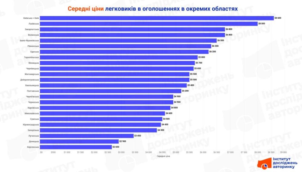 • Києві та Київській області — $8600 (+$200 за місяць). Причина — високий попит, вищі доходи населення та активність автосалонів.