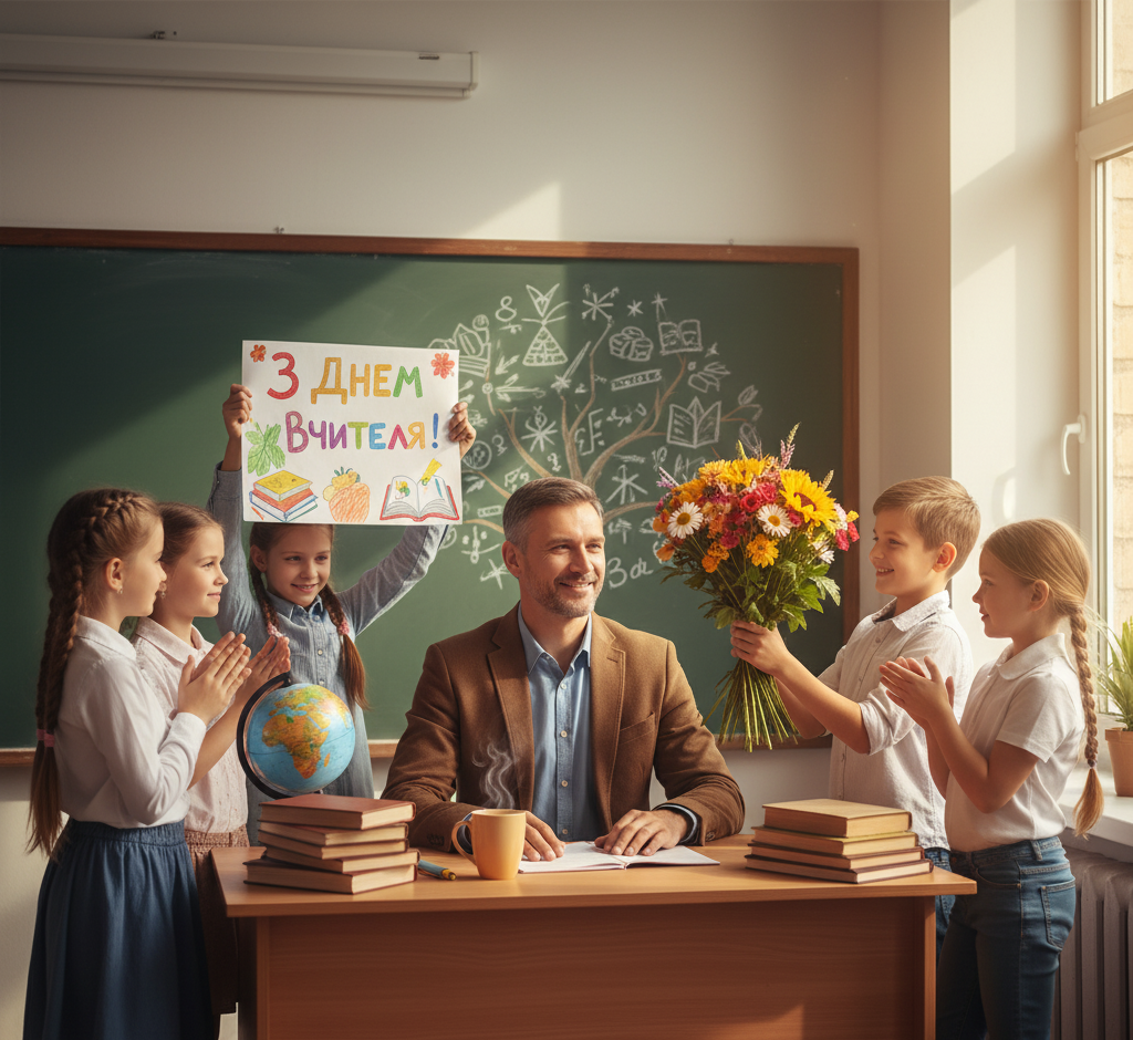 Дорогі вчителі! Вітаємо вас із професійним святом – Днем вчителя! Ваша праця безцінна: ви не просто даєте знання, ви формуєте майбутнє, запалюєте іскорки допитливості та вчите долати труднощі. Дякуємо вам за терпіння, мудрість, відданість і віру в кожного учня. Бажаємо вам міцного здоров'я, невичерпної енергії, творчого натхнення і щирої вдячності від ваших вихованців! Нехай кожен день буде наповнений радістю та успіхами!