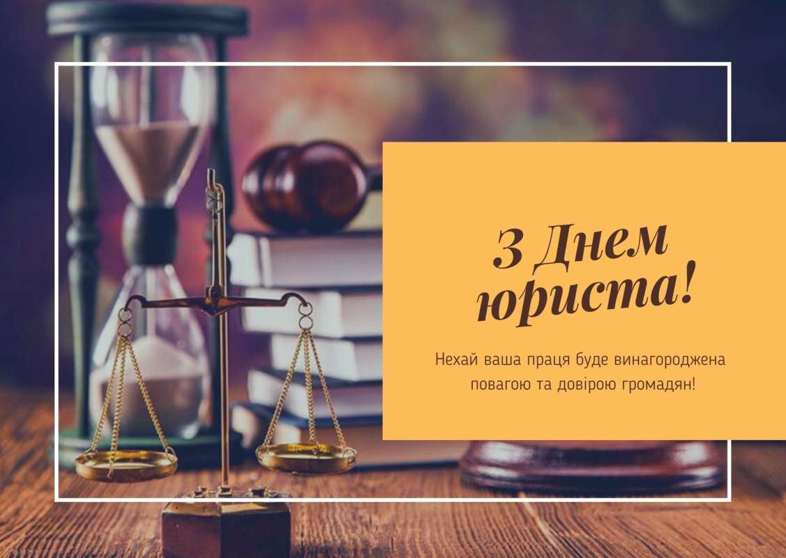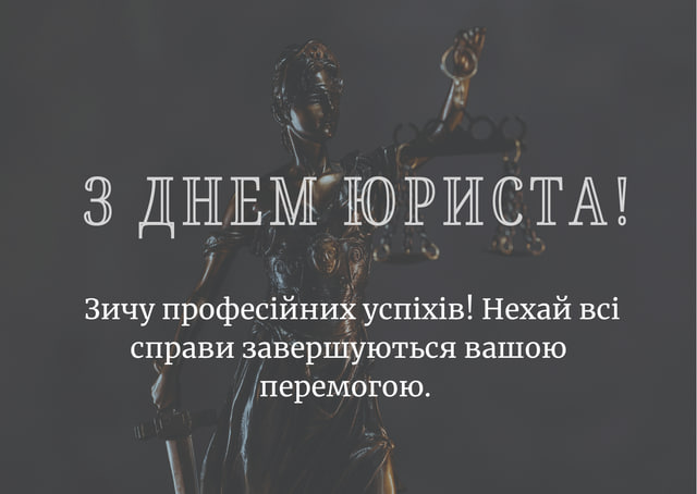 З Днем юриста України. Нехай буде легким і безперешкодним шлях юридичними кар'єрними сходами, нехай справедлива Феміда завжди підказує, як вирішити питання. Удачі й успіхів в юриспруденції, процвітання і щастя в круговерті цікавих подій життя.