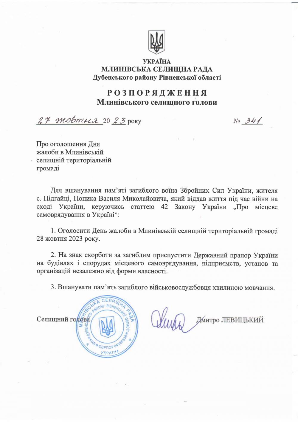 У Млинівській громаді 28 жовтня оголосили Днем жалоби за Василем Попиком.