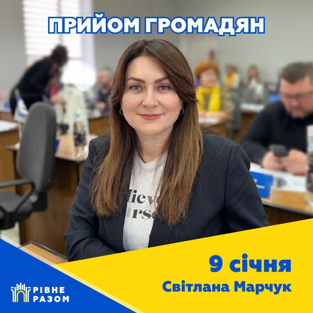 У вівторок, 9 січня, у громадській приймальні «Рівне Разом» особистий прийом громадян проведе депутатка Рівненської міської ради, членкиня постійної комісії з питань бюджету, фінансів та управління комунальною власністю Світлана Марчук.