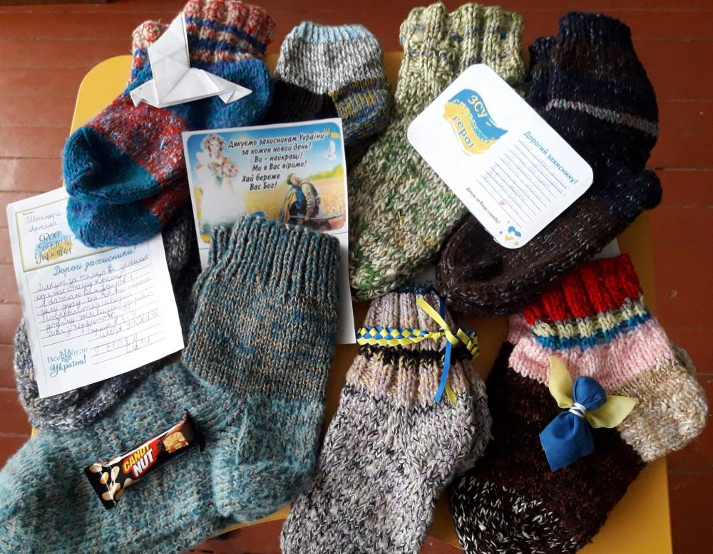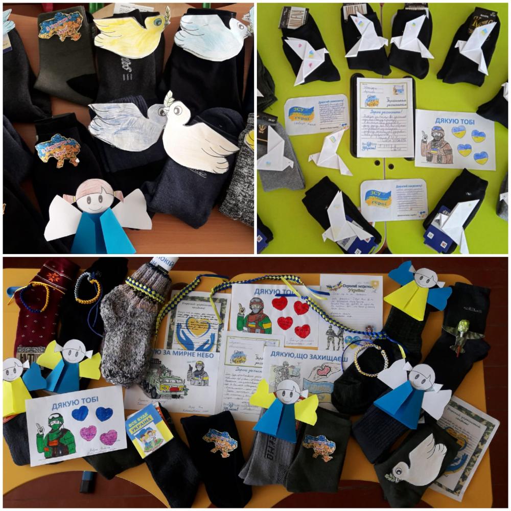 Загалом, учнями ліцею було передано 160 пар шкарпеток разом із листами, малюнками, солодощами для наших захисників та захисниць.