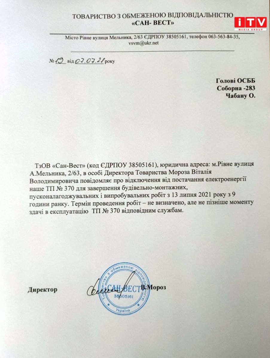 В результаті розмови домовилися, що ТП-370, яка належить ТОВ Сан Вест, до якого були підключені ці секції по тимчасовій схемі буде відновлено. Електропостачання по вулиці Соборна,283 увімкнуть сьогодні о 12 годині!