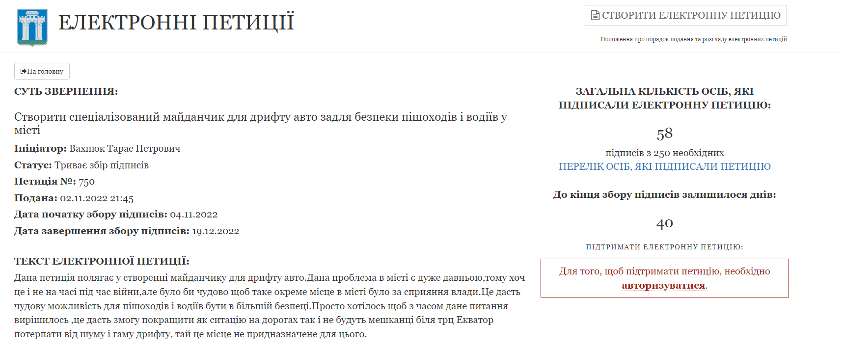 Наразі є 58 підписів з 250 неохідних. Дата завершення збору підписів — 19 грудня.