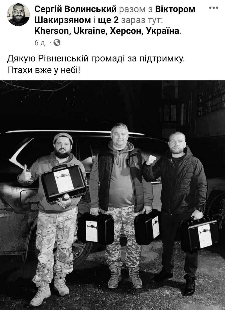 “Це спільний внесок нашої громади в Перемогу”, - розповідає секретар Рівненської міської ради, виконуючий обов’язки міського голови Віктор Шакирзян. - “Минулого року ми розгорнули масштабну програму підтримки наших Збройних Сил України. Придбали першу партію дронів у 80 штук, більша частина яких уже на лінії фронту, на черзі друга партія у 56 штук, в бюджеті 2024 уже передбачено перші 50 мільйонів гривень на придбання дронів чотирьох різних модифікацій. Загалом, на сесії міської ради ми прийняли масштабну програму з придбання дронів для ЗСУ на безпрецедентну суму в 500 мільйонів гривень. Вірю, що ці “пташки” обладнані приладами нічного бачення допоможуть зберегти не одне життя наших бійців”.