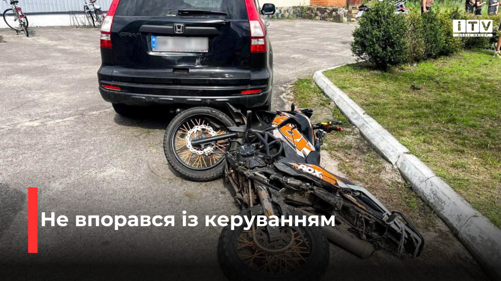 Від удару водій та пасажир упали, а некерований двоколісний продовжив рух та наїхав на припаркований легковик «Honda». Встановлено, що обоє молодиків були без мотошоломів.