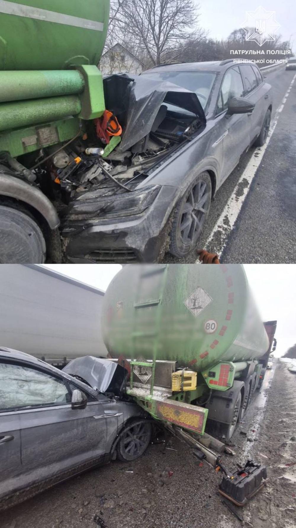 На місці події патрульні встановили, що 38-річний водій автомобіля Volkswagen не вибрав безпечної швидкості руху та не дотримався дистанції, унаслідок чого в'їхав у бензовоз Volvo з напівпричепом. Пального у бензовозі на момент скоєння ДТП — не було.