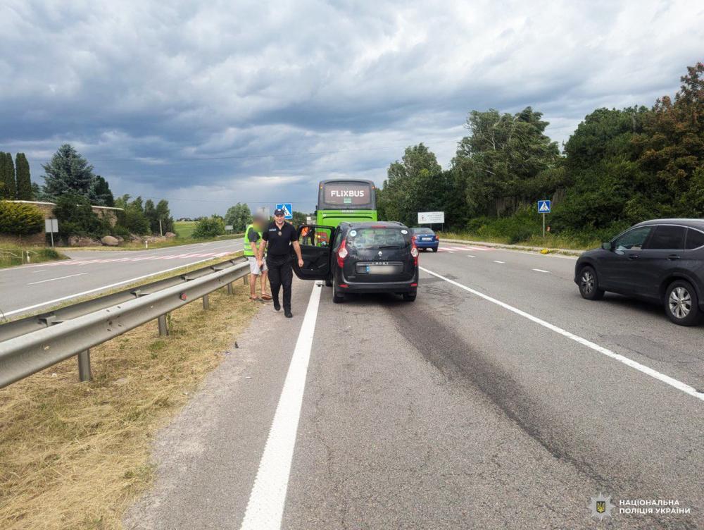 Нараз відомо, що водій автомобіля «Renault Lodgy», 42-річний житель Київщини допустив зіткнення із припаркованим на узбіччі автобусом «MAN» міжнародного сполучення «Бремен-Київ».