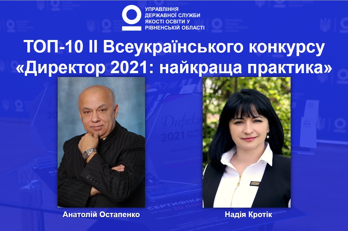 Як інформують в Управлінні Державної служби якості освіти у Рівненській області, керівник Володимирецького ліцею "Колегіум" Анатолій Остапенко та директорка Боремельського НВК "ЗОШ І-ІІ ступенів-колегіум" Надія Кротік ввійшли до ТОП-10 фіналістів конкурсу.
