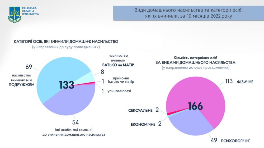 За словами начальниці ювенального відділу обласної прокуратури Олени Ткачук, ситуація на Рівненщині загалом відповідає сумним загальноукраїнським тенденціям. Так, упродовж цього року на території області обліковано понад 220 кримінальних правопорушень, пов’язаних з домашнім насильством. 167 обвинувальних актів цієї категорії вже скеровано до суду.
