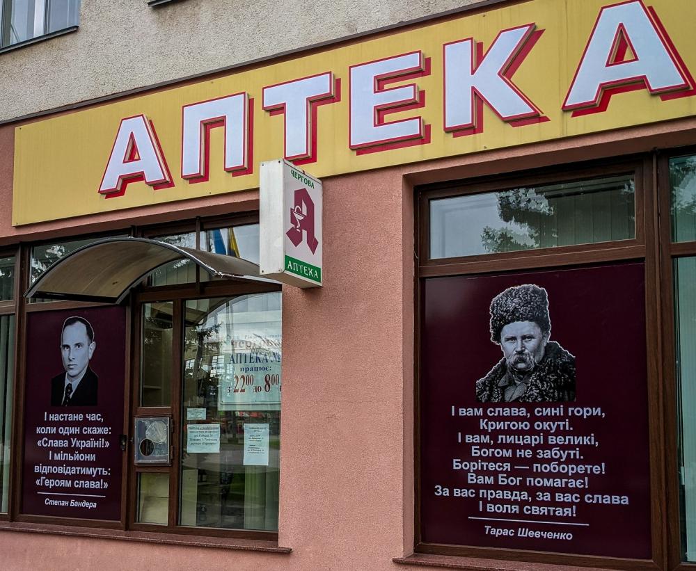 Фасади рівненських аптек прикрасили цитатами і віршів відомих українських поетів. Зокрема Тараса Шевченка, Степана Бандери і Ліни Костенко.