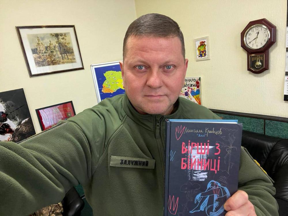 Валерій Залужний зробив фото у своєму кабінеті. У руках він тримав збірку Максима Кривцова "Вірші з бійниці". Цю книжку внесли до рейтингу найкращих книг 2023 року за версією ПЕН Україна.