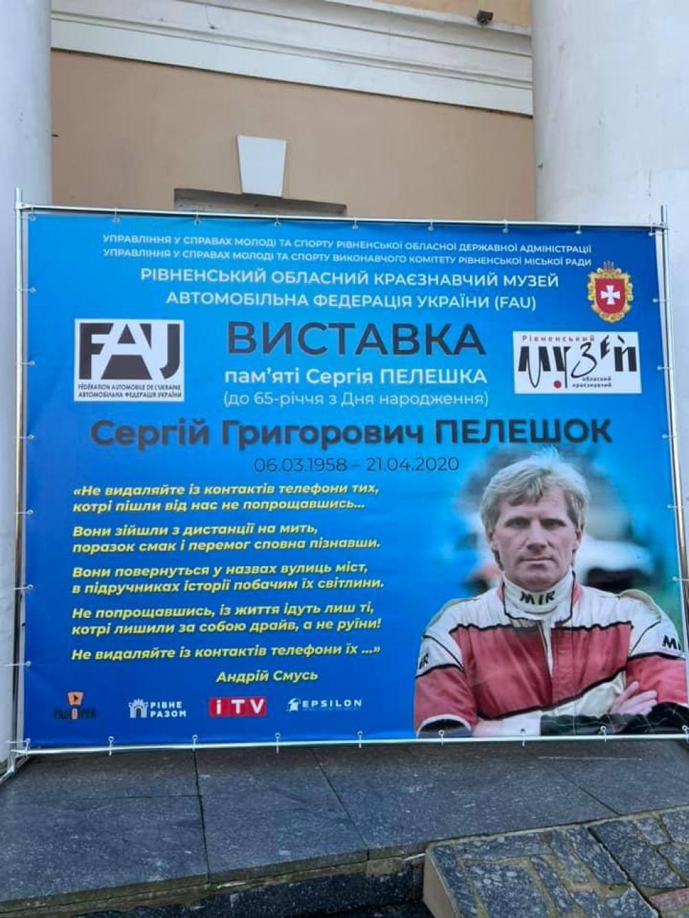 10 березня у Рівненському обласному краєзнавчому музеї відкрилась виставка, присвячена пам’яті видатного спортсмена з Рівного. Сергій Пелешок був 16-ти разовим чемпіоном України у шести дисциплінах автоспорту. Він раптово пішов з життя у 2020-му році.