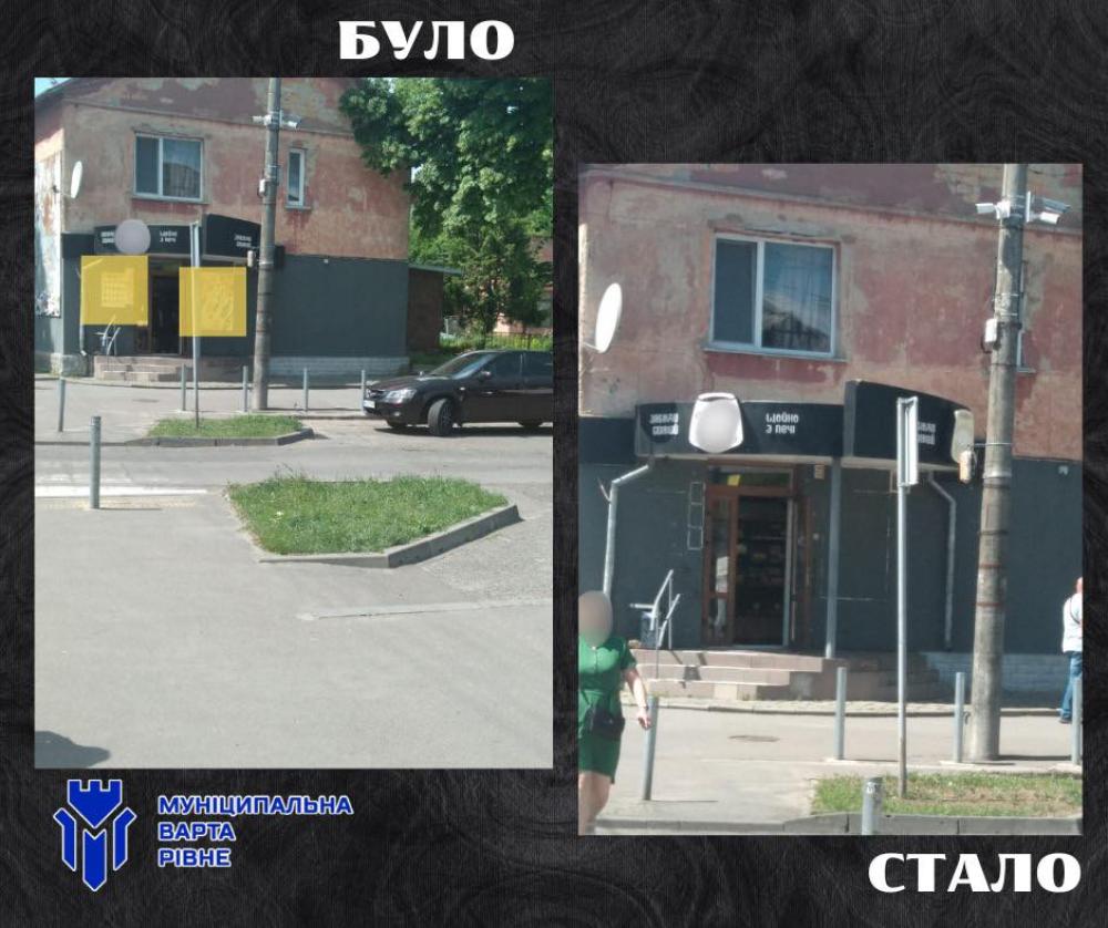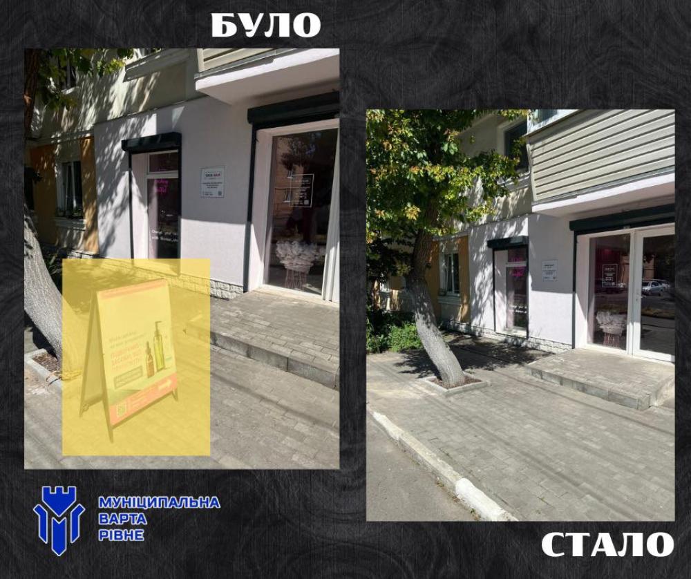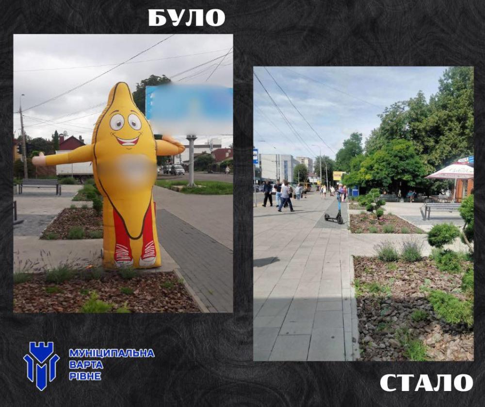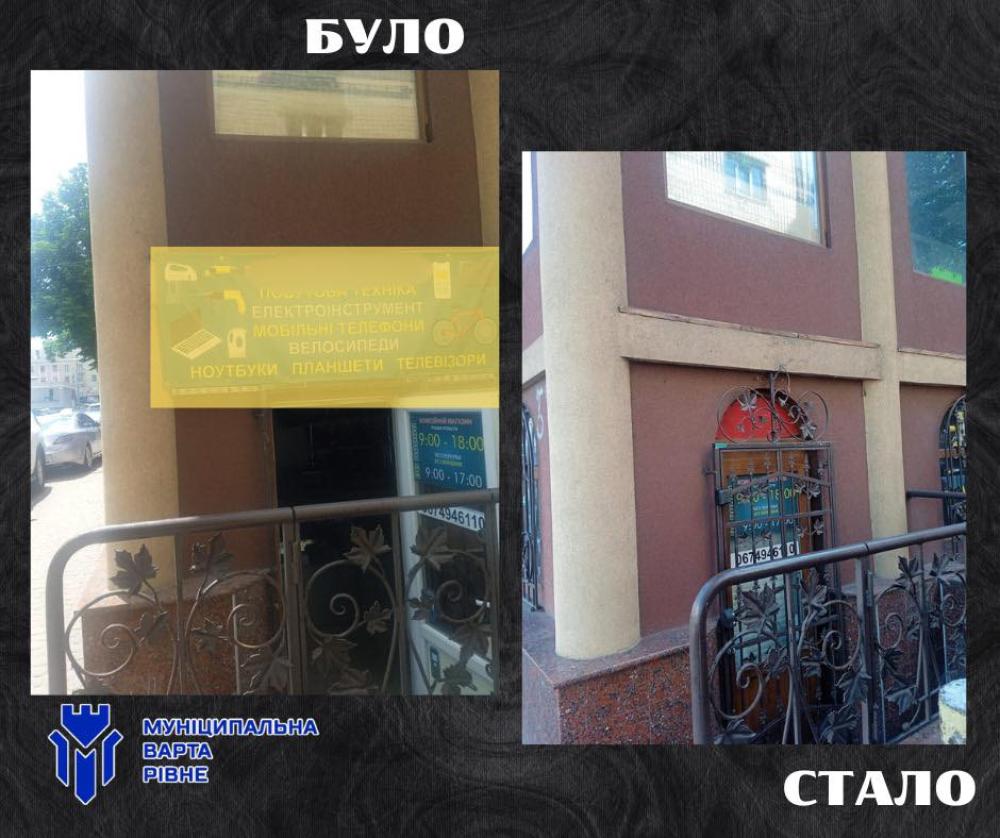 Так, із приміщення Укрпошти у центральній частині Рівного зняли рекламний банер та два електронних табло, що псували архітектурний вигляд та порушували правила розміщення зовнішньої реклами у місті.