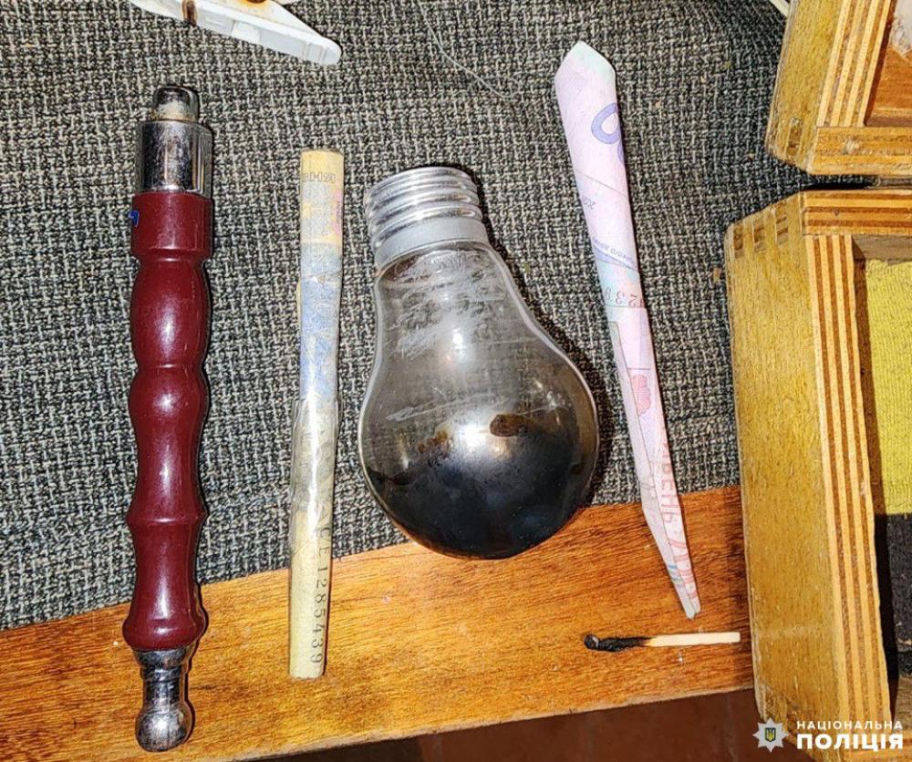У ході слідчих дій правоохоронці виявили та вилучили подрібнену суху речовину, висушені рослини конопель, а також пристрій для куріння та пакетик із метамфетаміном. Чоловік пояснив, що зберігав наркотики для власного споживання.