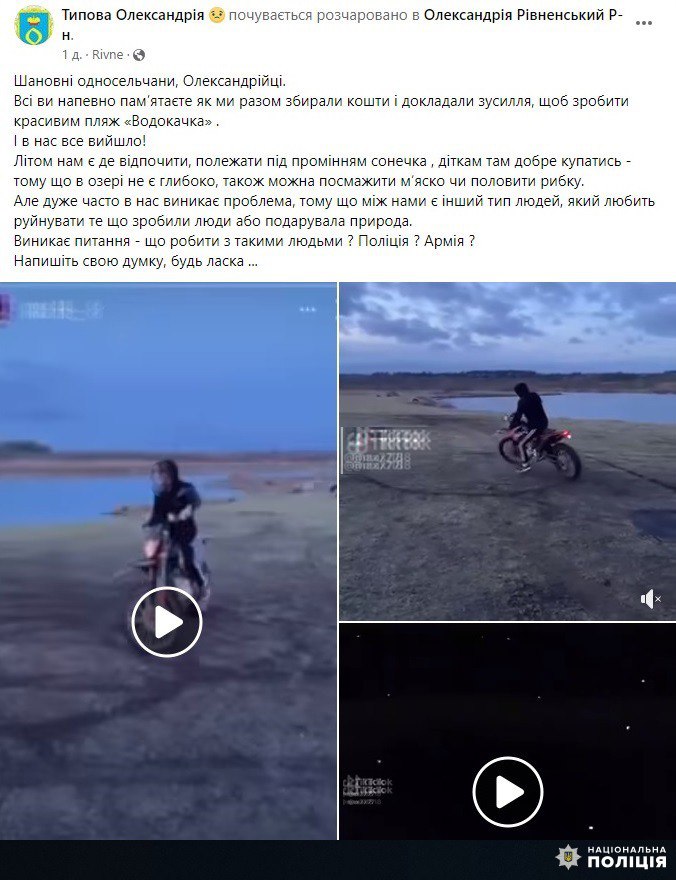 Днями у соціальних мережах поширили відео, як у селі Олександрія невідомий на мотоциклі «дрифтував» на пляжі місцевої водойми, який облаштували мешканці громади.