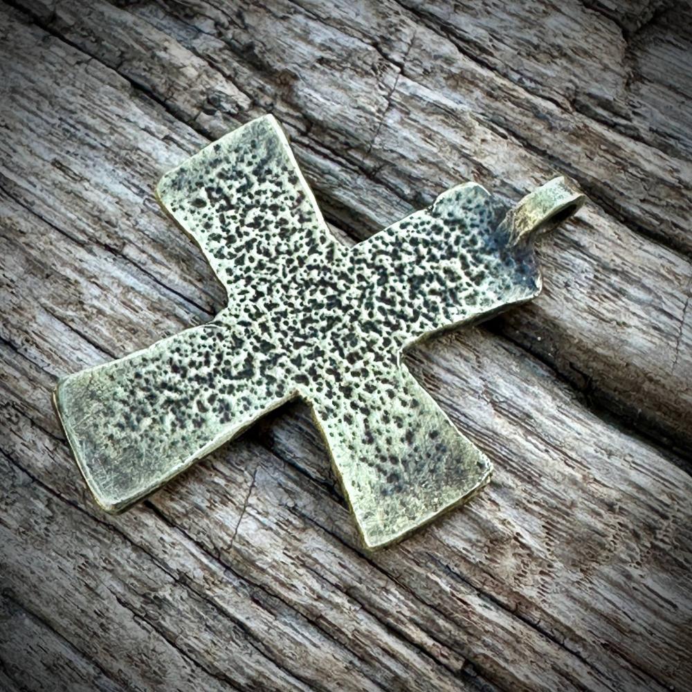 Артефакт датують ХІ століттям. Хрест має чотири розширені рамена та масивне вушко для кріплення. Виріб виготовлений з бронзи у техніці лиття, а патинований метал підкреслює його давність.