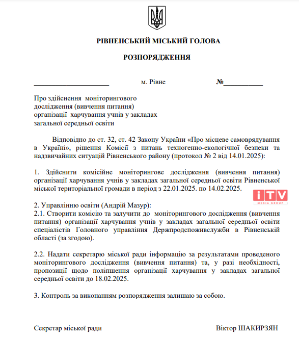Перевірити їдальні ліцеїв та гімназіїй Рівного повинні до 14 лютого. Результати надати - до 18.