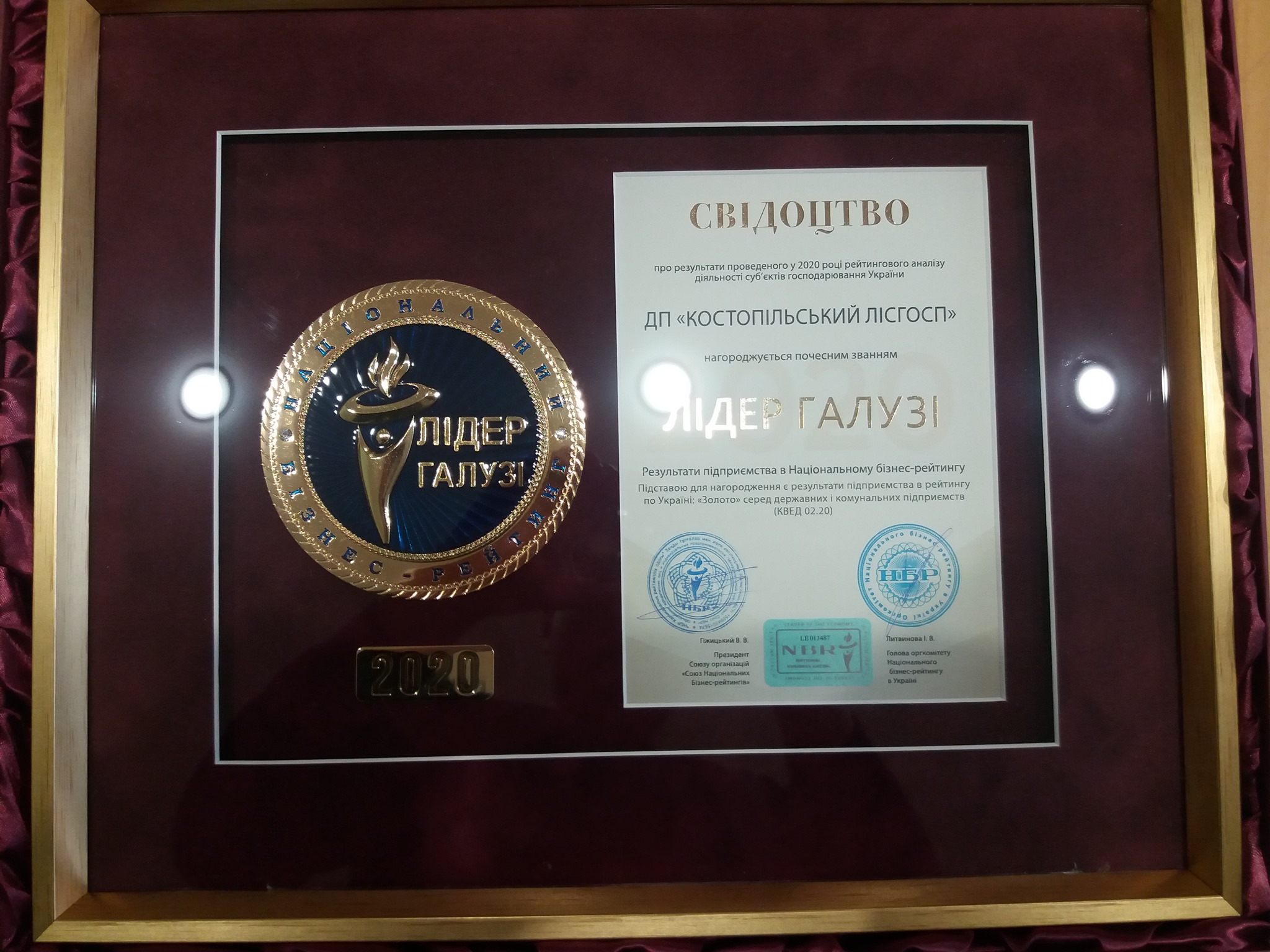 ДП "Костопільський лісгосп" здобув перемогу у Національному бізнес-рейтингу "Лідер галузі 2020" за результатами проведеного у цьому році рейтинговому аналізу діяльності суб'єктів господарювання України.