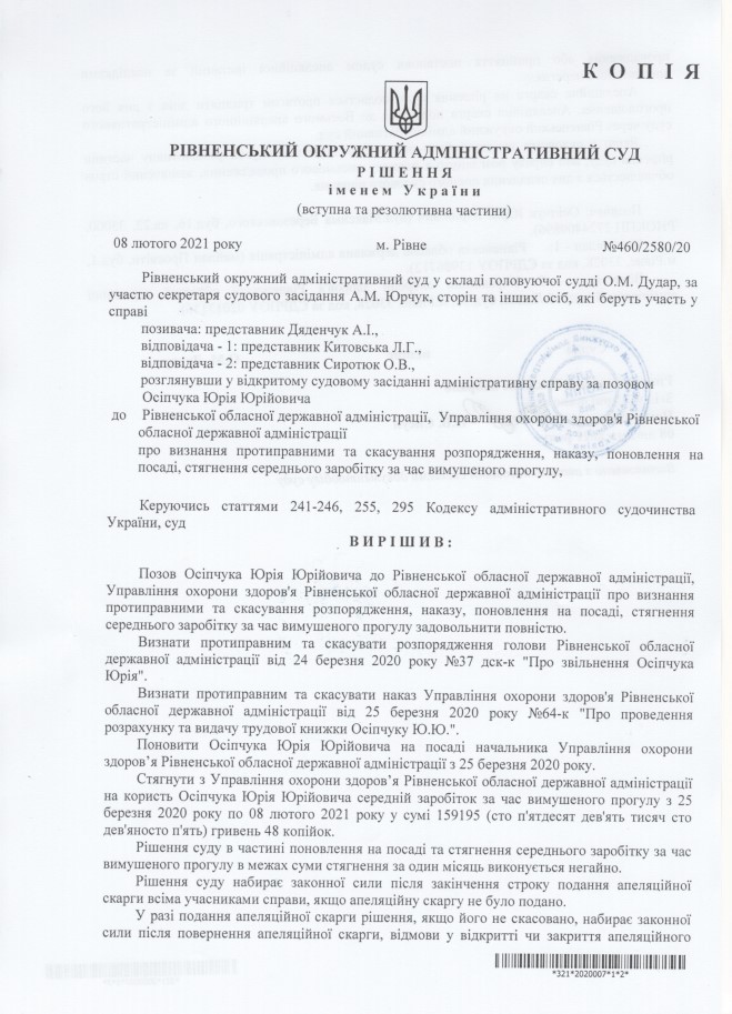 Тож, за рішенням суду, усі вимоги Юрія Осіпчука потрібно задовольнити, а саме поновити Юрія Осіпчука на посаді начальника управління охорони здоров'я Рівненської ОДА та виплатити йому 159 195 гривень 48 копійок.