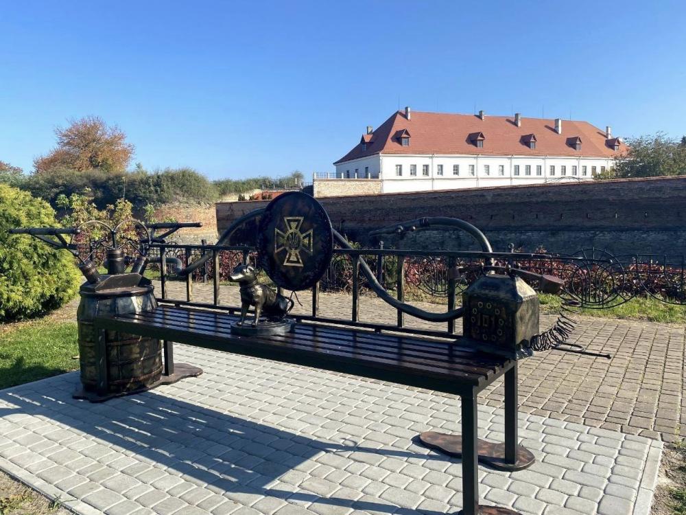 Ковану металеву лавку працівники ДСНС виготовили власноруч. З лівої сторони лавки розміщений ретро-телефон по якому на початку XX ст. телефонували до вогнеборців. З правої сторони розміщена раритетна пожежна мотопомпа кінця ХІХ ст. якою активно гасили пожежі минулого.