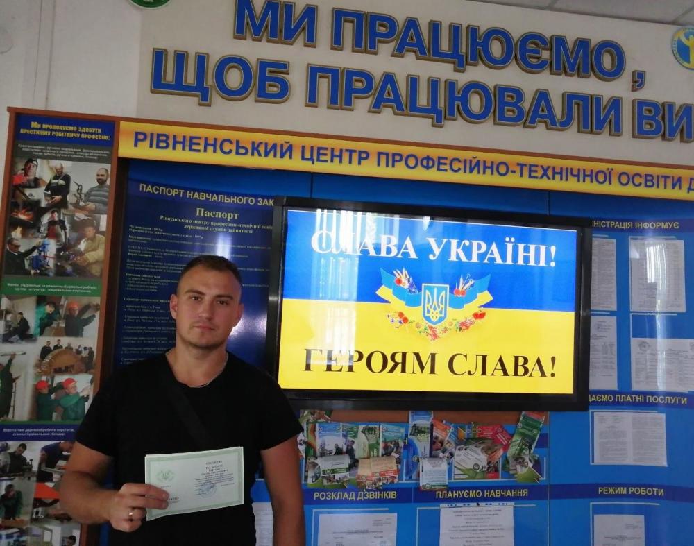 27-річний Дмитро Кирилюк із Рівного став кваліфікованим робітником за 2,5 місяці. За підсумками навчання та результатами державної кваліфікаційної атестації випускник отримав свідоцтво державного зразка лицювальника-плиточника 3 розряду.