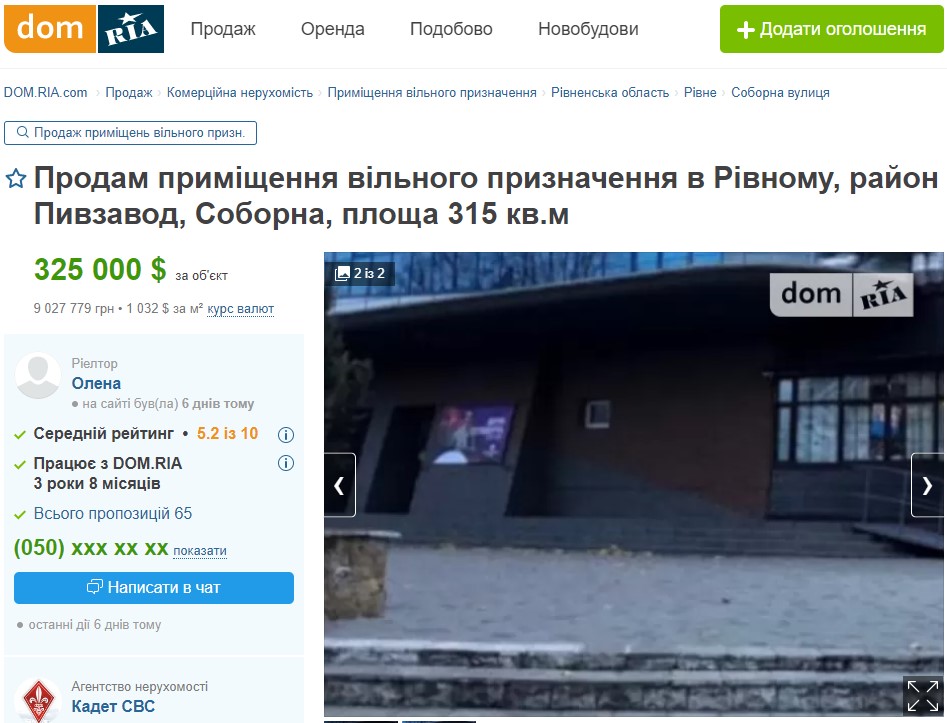 Продаж супроводжується агентством нерухомості "Кадет СВС", яким, до слова, керує дружина першого заступника голови Рівненської облдержадміністрації Сергія Подоліна Інна.