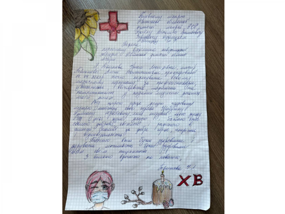 Замість звичних друкованих на принтері аркушів чи повідомлень у соцмережах мама маленької пацієнтки написала подяку від руки. А її донька, яку оперували, прикрасила його своїми малюнками.