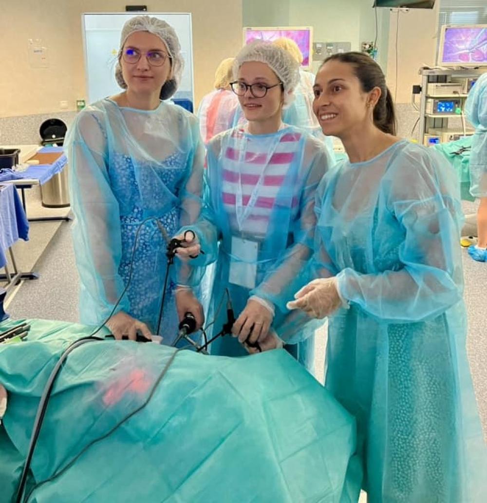 Навчання передбачало присутність в операційній, асистенцію, спілкування з лікарями та обговорення клінічних випадків. У другій половині дня – праця в тренінговому центрі на лапароскопічних тренажерах.