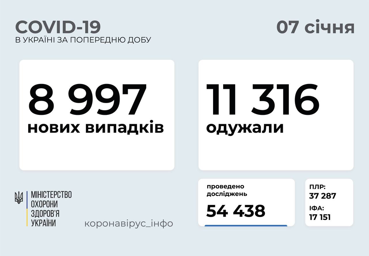 8 997 нових випадків коронавірусної хвороби COVID-19 зафіксовано в Україні станом на 7 січня 2021 року. Зокрема, захворіли 227 дітей та 385 медпрацівників.