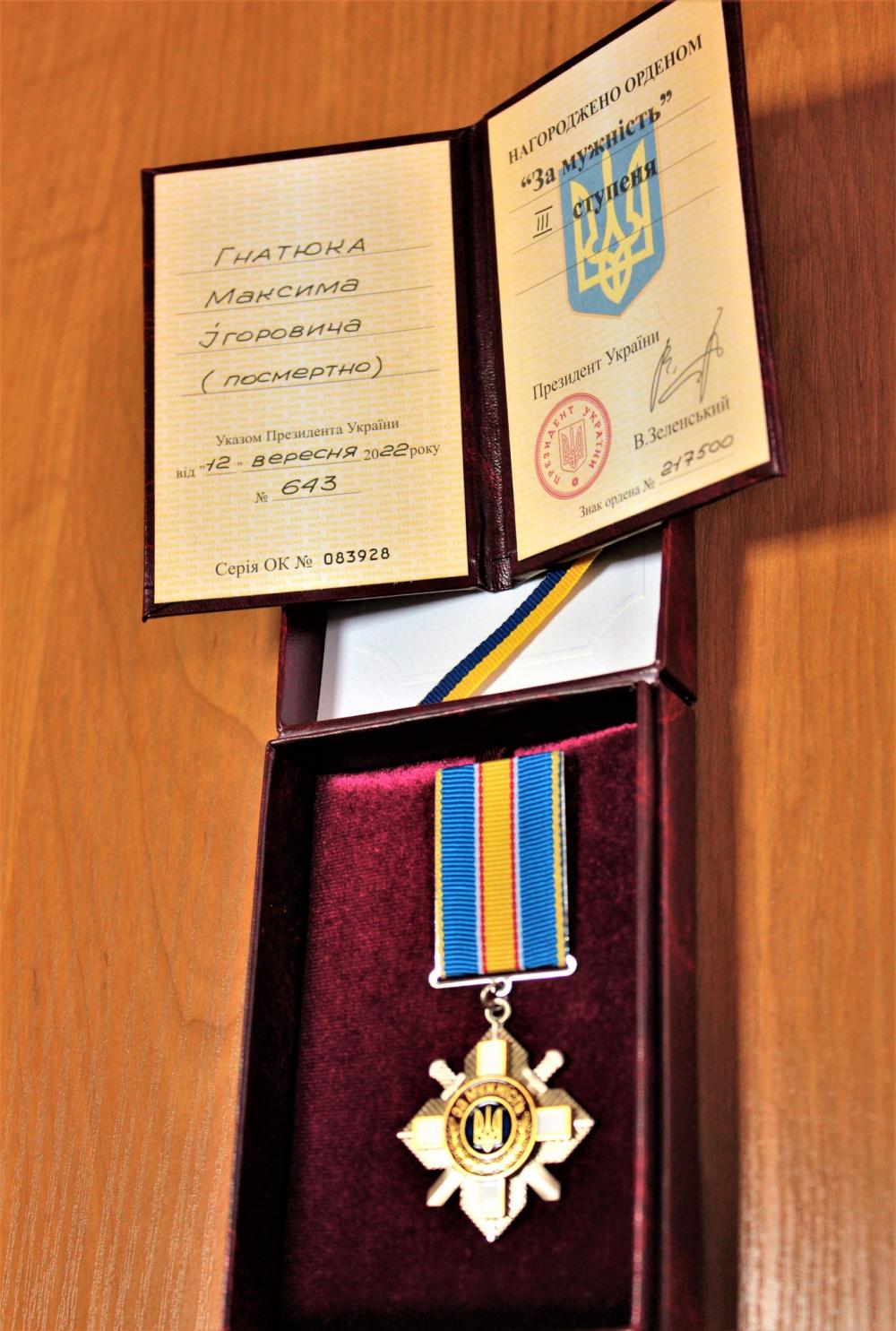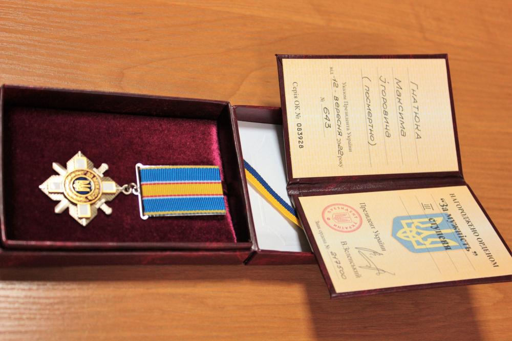 Мамі та дружині загиблого військового з Рівненщини, Гнатюка Максима Ігорьовича, передали нагороду його нагороду - орден «За мужність».