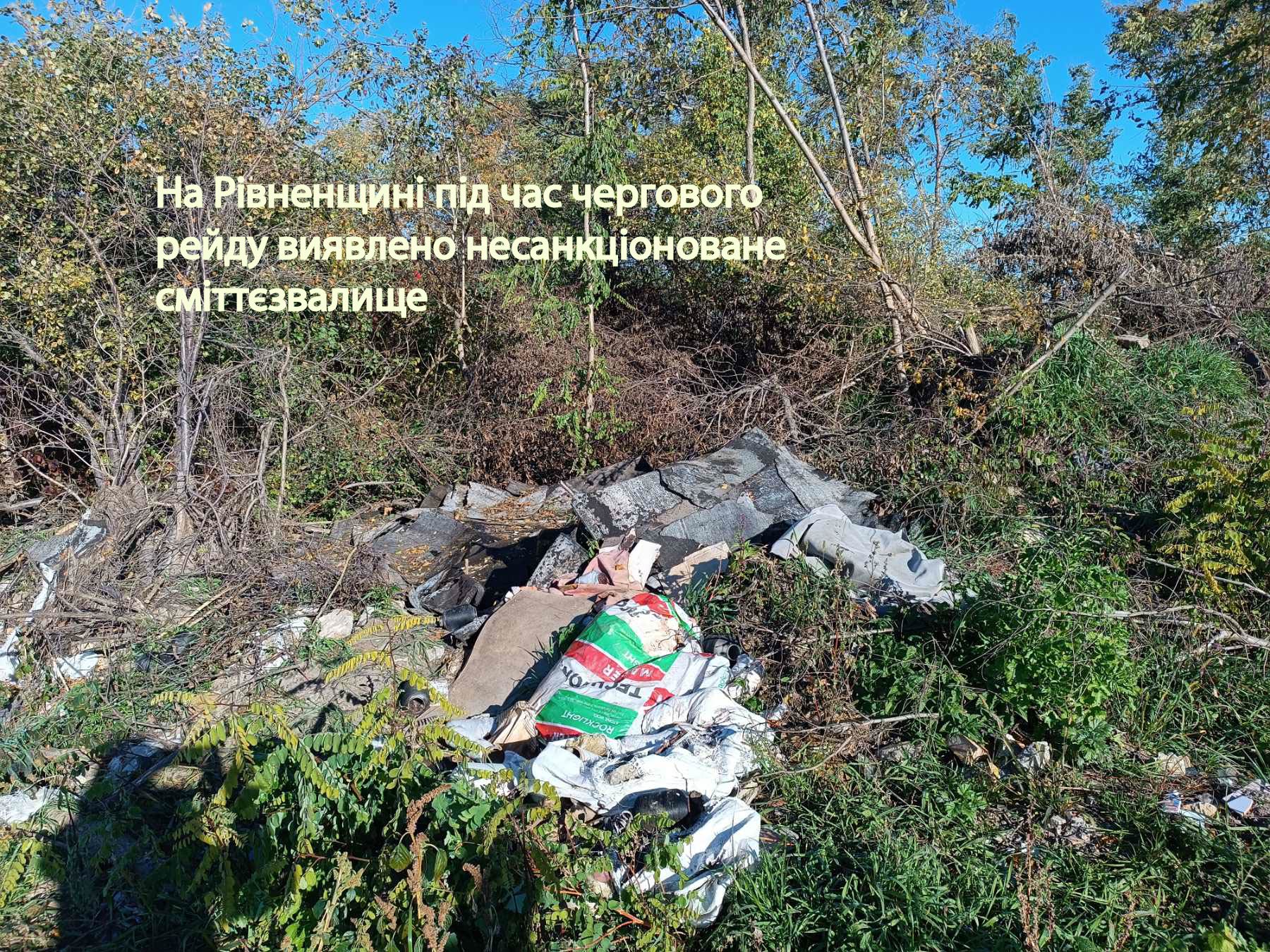 Під час одного із таких заходів державними інспекторами виявлено несанкціоноване розміщення твердих побутових відходів між селами Вересневе та Тинне, що належать до Великоомелянської ОТГ Рівненського району.