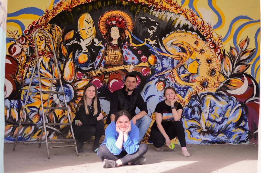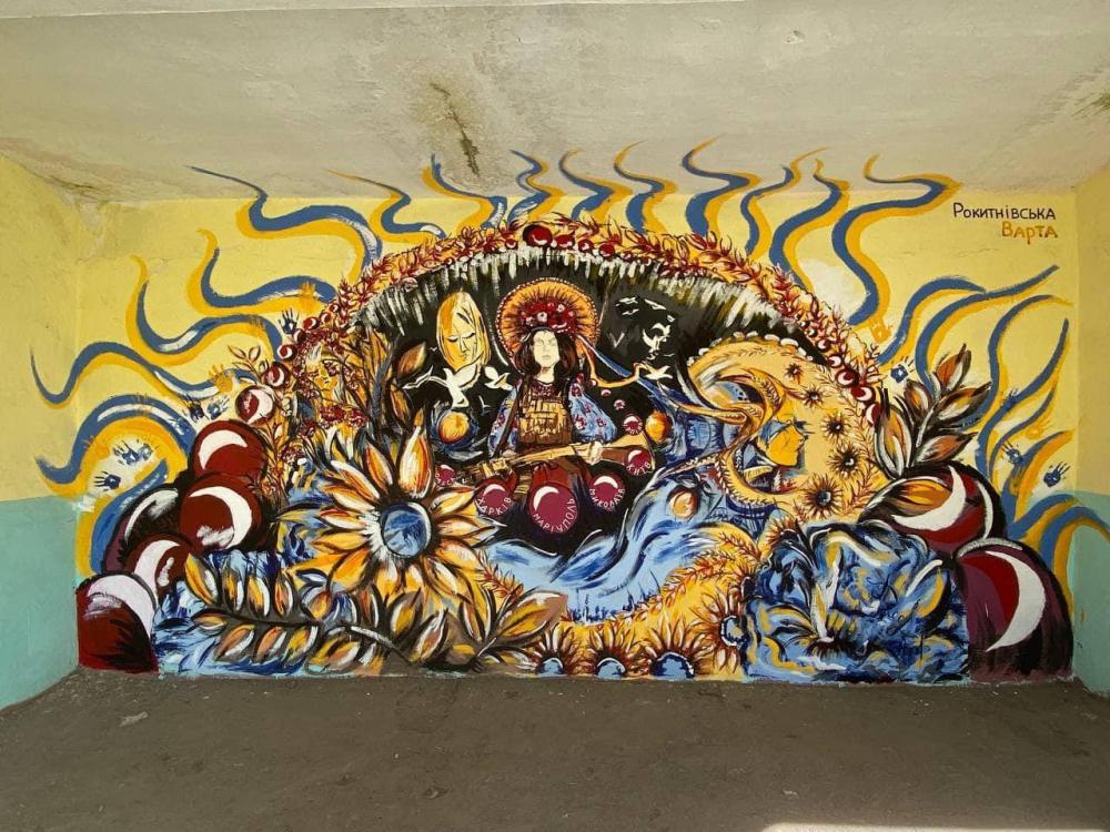 Мурал створювали Софія Денисюк з друзями. Фарбу закупляли самі. Працювали над втіленням ідеї три дні. Нагадаю, раніше вони розмалювали стіни укриття Петриківським розписом.