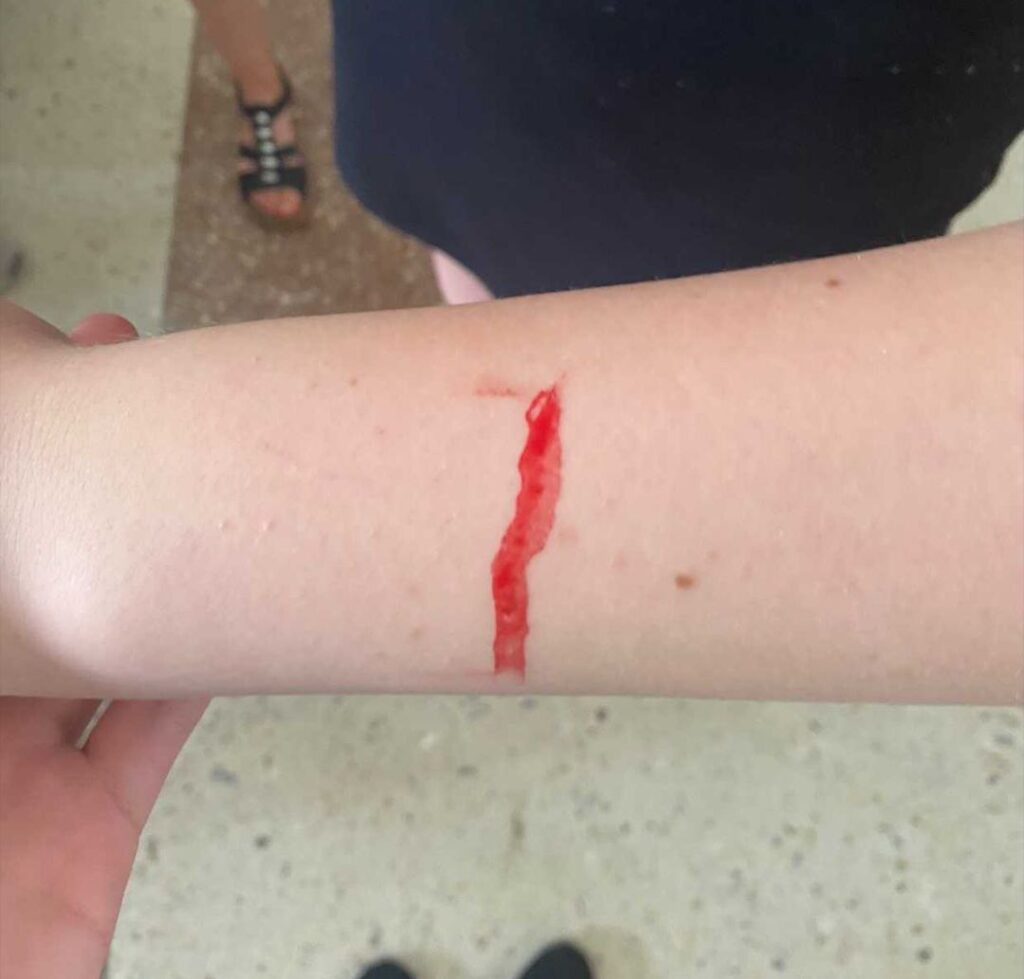 Була в нас аптечка, одразу їй замастили. Батько тут недалеко працює, привели його, був стривожений. Але подивились, що все нормально, цю царапину можна отримати і агрус збираючи.
