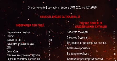 За минулий тиждень з 9 по 16 листопада рятувальниками здійснено 35 виїздів на ліквідацію пожеж, надання допомоги та знищення боєприпасів часів війни.